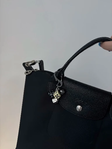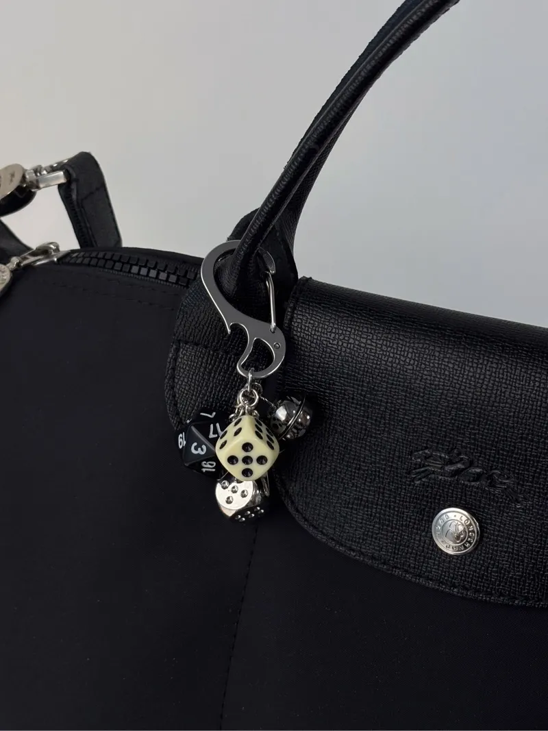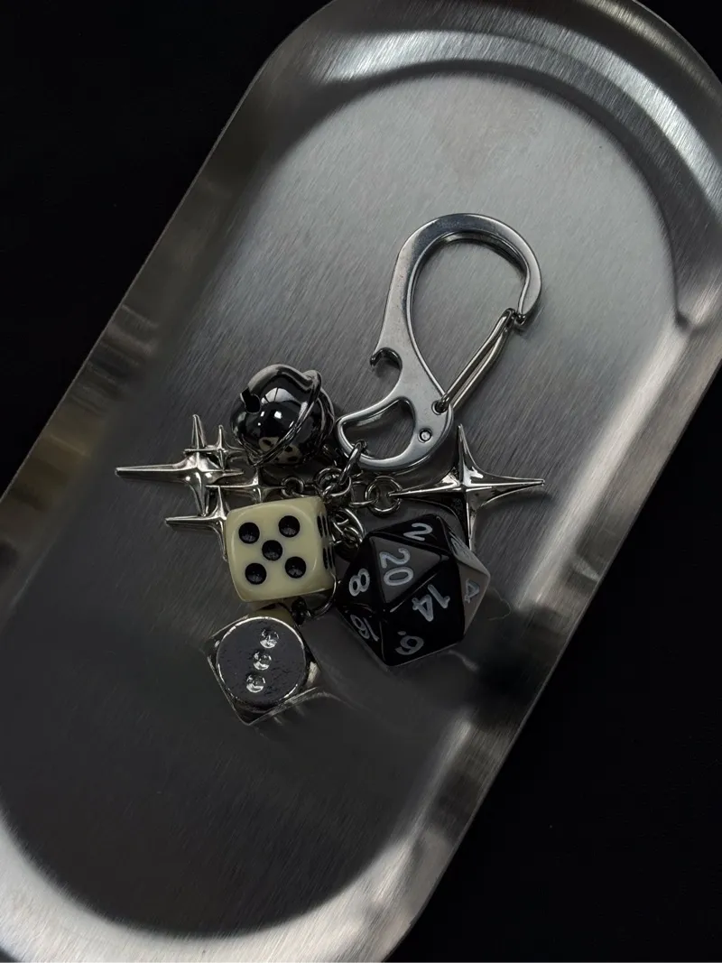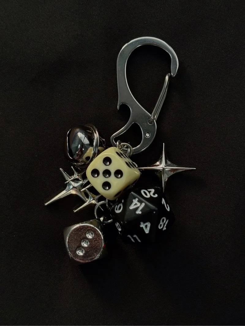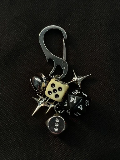 Embrace the mystery and roll with destiny using the bold “Dark Fate” Dice Charm. This edgy, monochromatic accessory is a complex cluster of high-contrast gaming pieces and sleek chrome accents. Featuring three distinct dice??a classic black d20, a retro cream d6, and a unique metallic die??plus sharp star spikes and a reflective chrome bell, this charm is perfect for those who favor a darker aesthetic and a dramatic style. Clip it to your gear for an instant, striking upgrade.