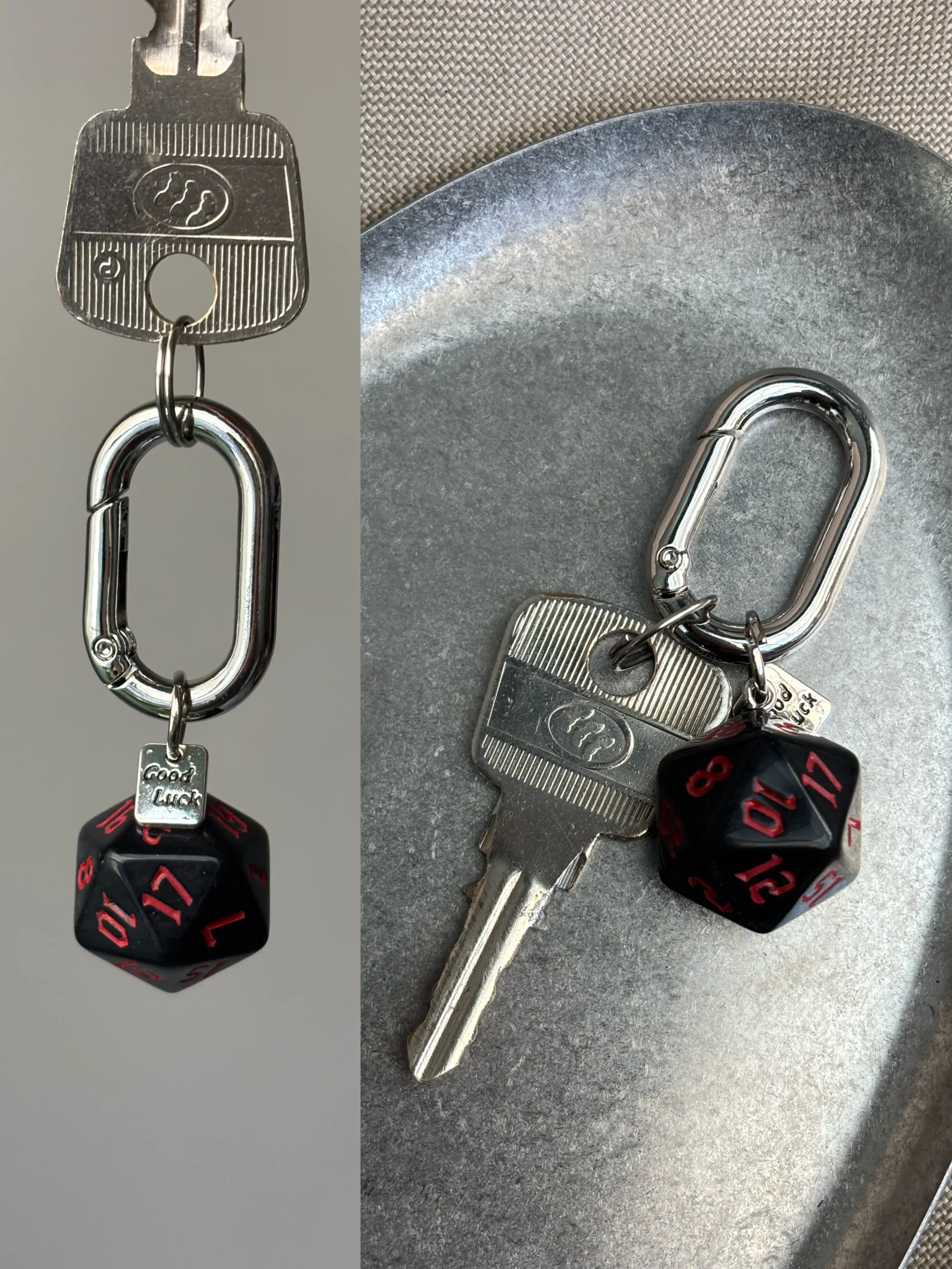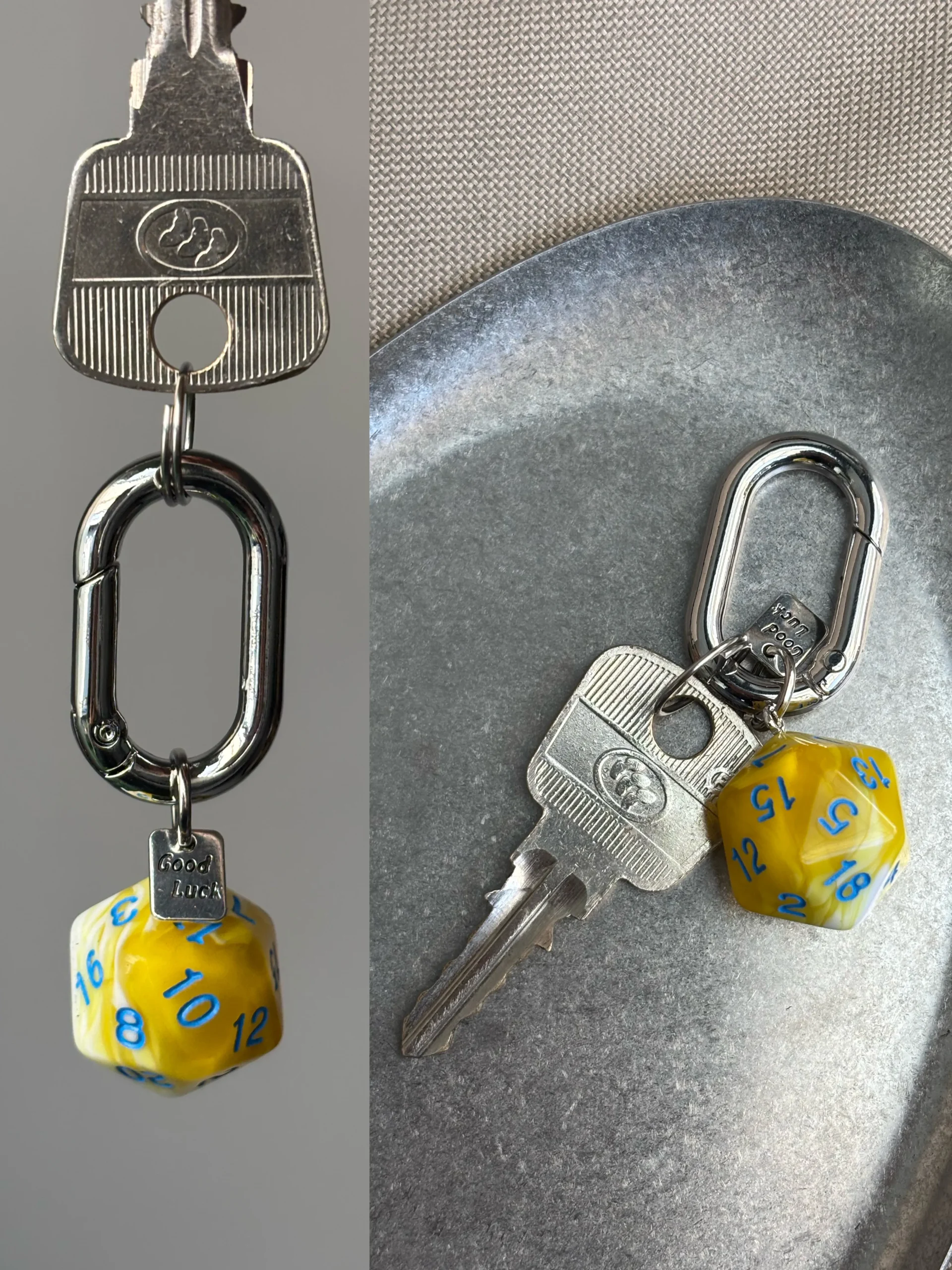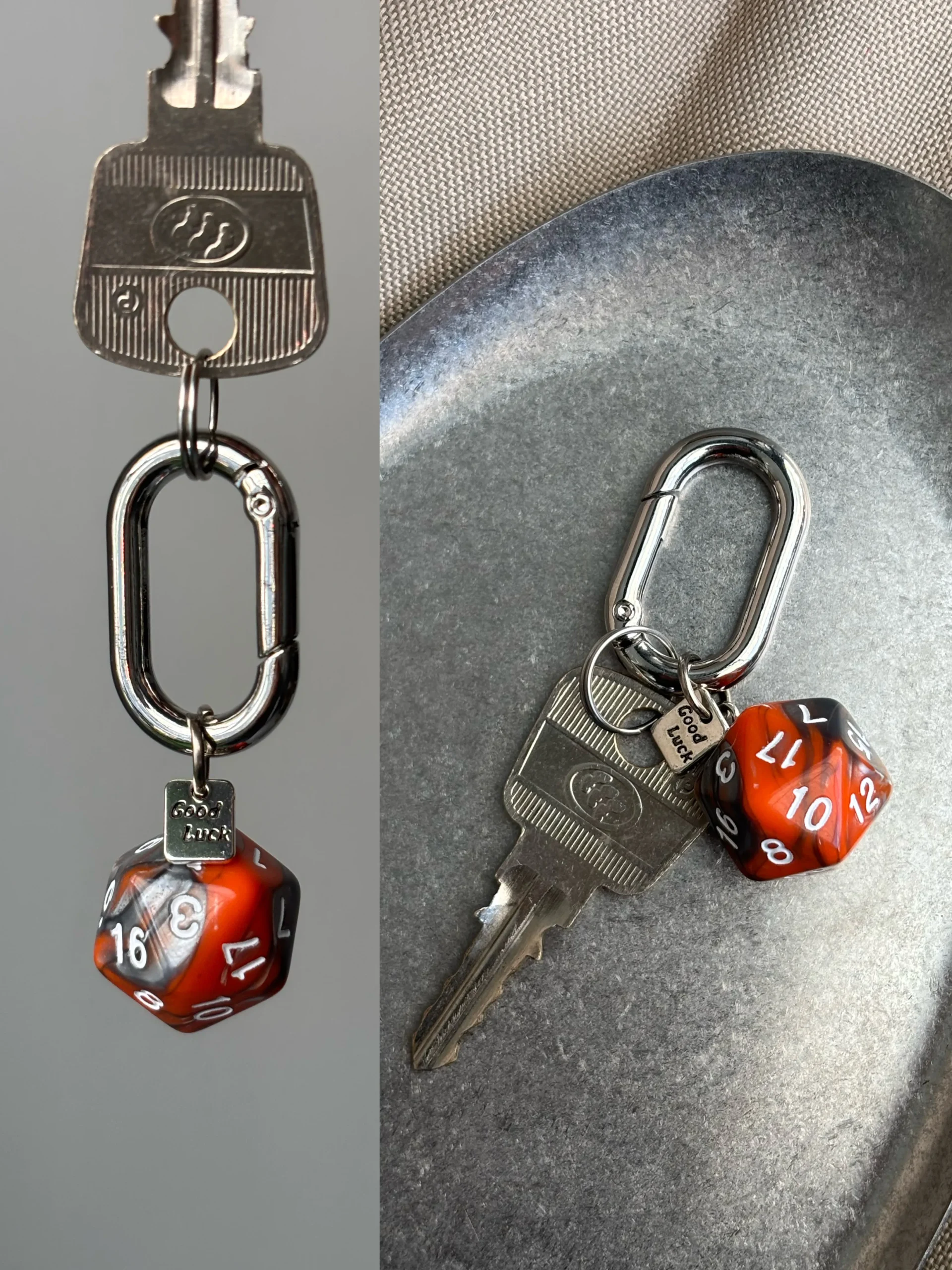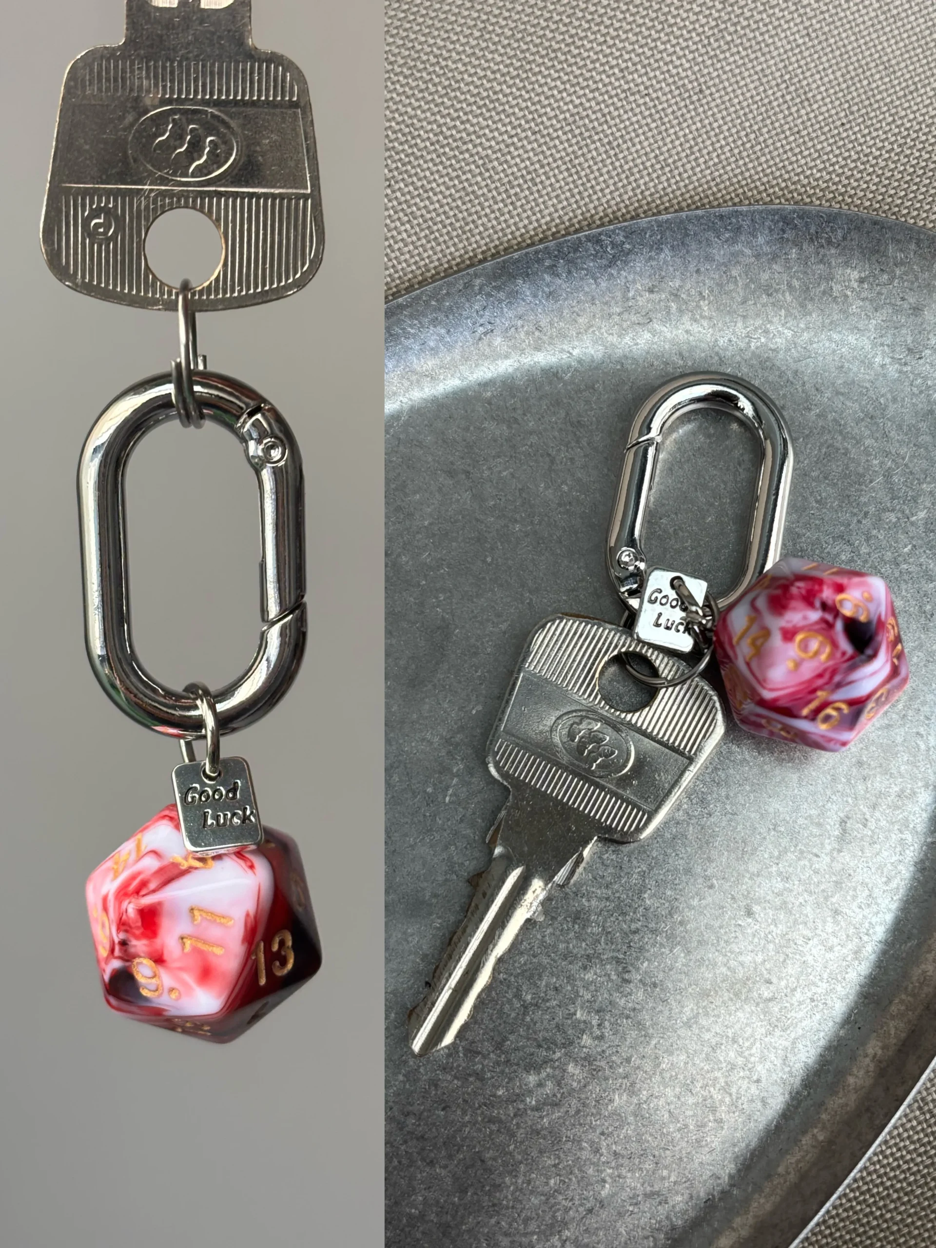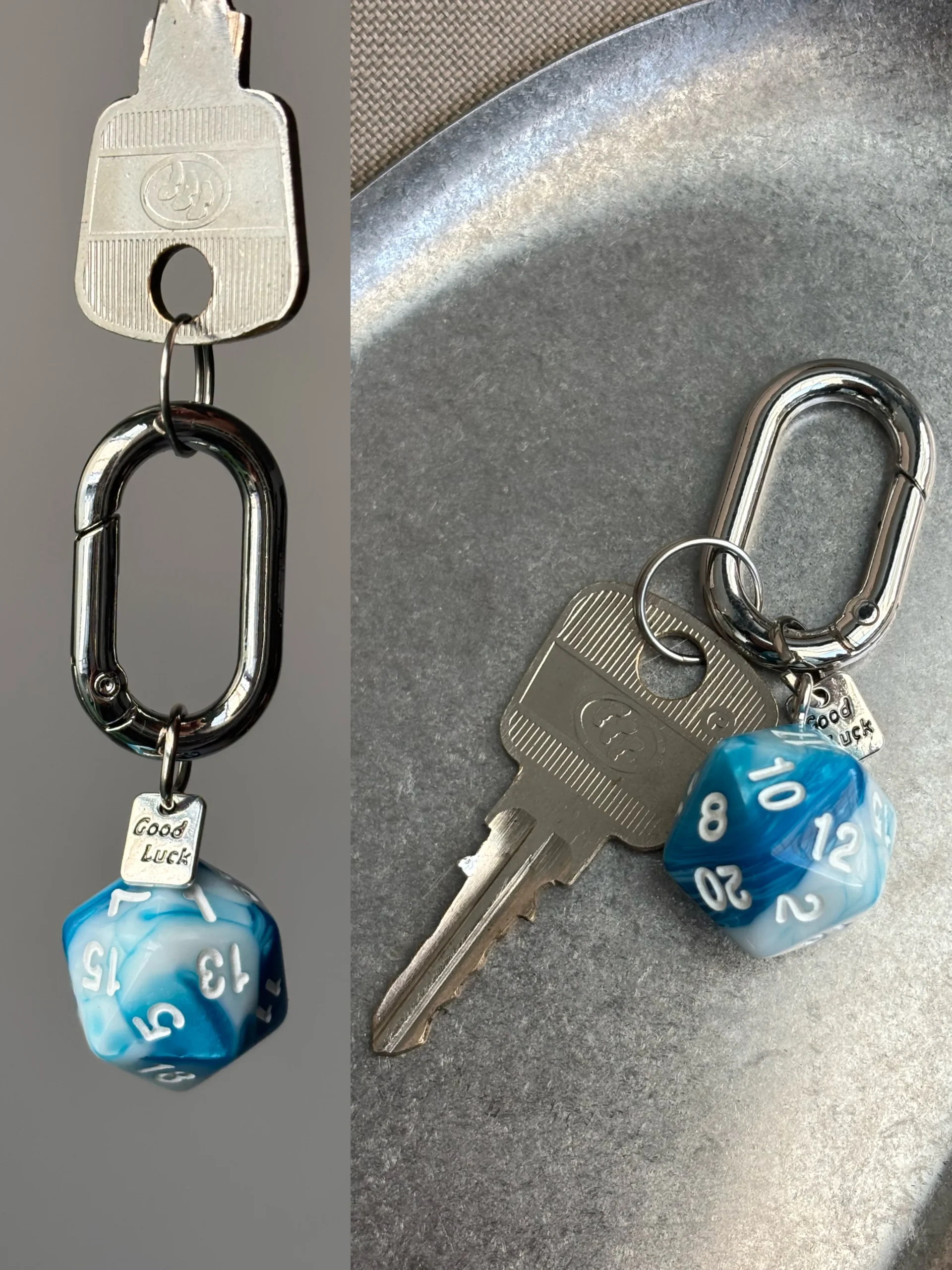 Roll for success and style with the “Flowing Light” Dice Keychain. This minimalist yet striking accessory features a single, gorgeous marbled d20 polyhedral die, where colors swirl and blend like liquid light. Each die is a miniature work of art, attached to a heavy-duty, carabiner-style clip and a sweet “Good Luck” charm. Choose your favorite hue and let this charm bring a flash of fantasy and fortune to your keys, bag, or gear.