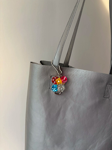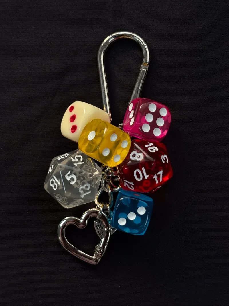 Celebrate your love for color and community with the vibrant “Unity” Dice Cluster Charm! This striking accessory brings together a playful collection of five or more polyhedral dice in a kaleidoscope of colors and patterns, symbolizing the diverse rolls of life and the fun of shared adventures. Anchored by a heart-shaped carabiner and a sweet “Made With Love” tag, this oversized charm is a bold statement piece. Clip it to your bag or keys for an instant, joyful pop of personality and luck!